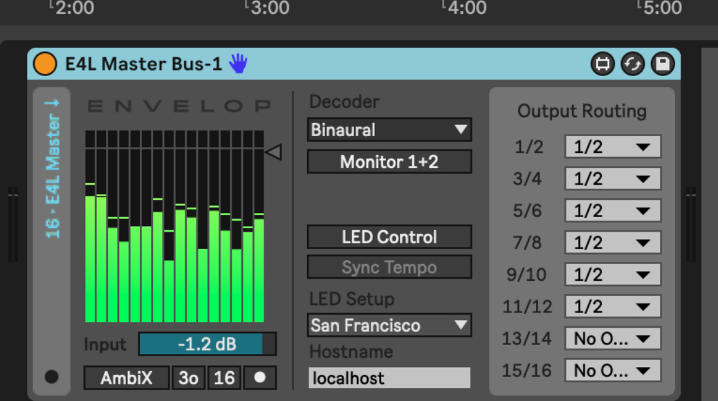 To mix my project in 3rd Order ambisonics, I have used the Envelop for Live (E4L) plugins for Ableton Live. A platform designed to allow composers and artists to mix music in an immersive format for spatial audio distribution, performance, virtual reality and sound design (Envelop, 2022). The software contains ambisonic effects, source, stereo and mono panner. These plugins allowed me to place elements within the ambisonic sound field, as well as automate the azimuth and movement features within each encoder plugin. A decoder in the E4L master bus then translates the ambisonic mix to the speaker configuration used (ibid).