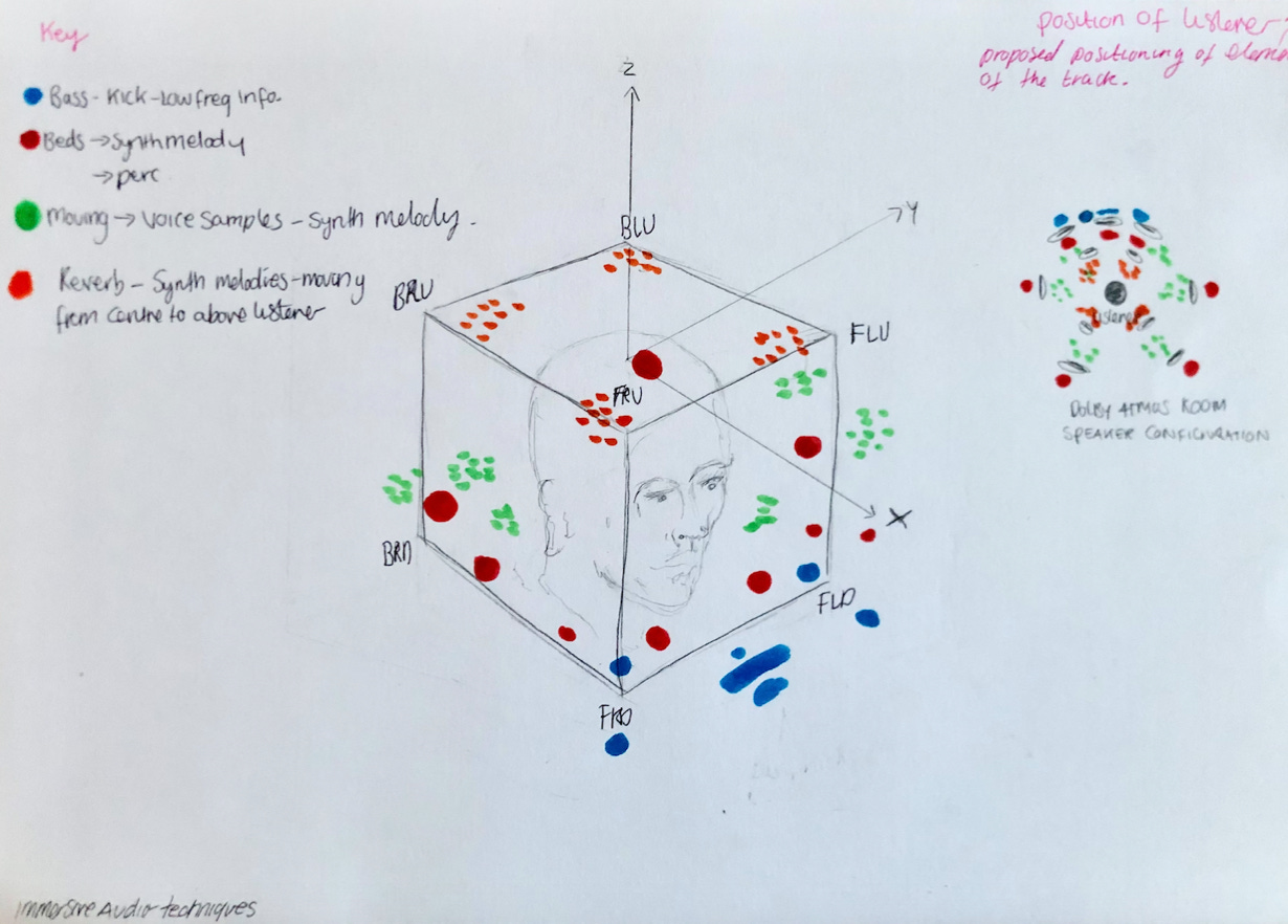 This conceptual framework has informed my decisions about placing each instrument, rhythm, texture and voice within the ambisonics mix I have created. Therefore, it inspired me to announce my decision to showcase the piece using live midi mapping. To control the movement of some aspects of the ambisonic mix, although I am not the physical cause of the sound, I will embody the perception of the direction of some elements of the mix.