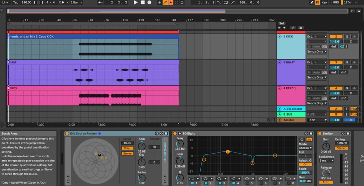 Screen capture of the Ableton Project - using the source panner to place the kick within the ambisonics sound-field.