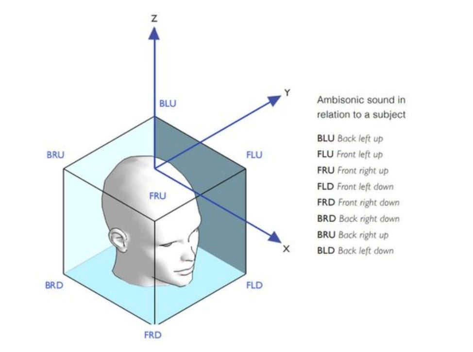 B-format is the leading audio format for Higher Order Ambisonics and the format used for this project. In this format, the individual channels do not correspond to direct speaker feeds but instead contain the components of the ambisonic sound field that are then decoded for audio playback on speakers (Blue Ripple Sound, 2022). Moreover, it allows multi-channel audio to be generated, recorded and transferred to a combination of speaker configurations. Ambisonic audio also contains an ‘order’ component that allows for increased spatial detail, meaning that new channels are added when the order is increased (ibid). Therefore, in zero order, just one mono channel is present; in the first order, three additional channels are added; to make four. Each channel conducts as a figure of eight microphone (ibid).